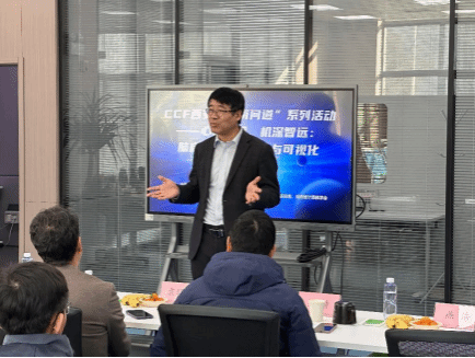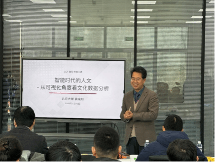 在报告环节,袁晓如研究员作了题为《智能时代的人文——从可视化角度看文化数据分析》的精彩报告。他详细介绍了基于人工智能的可视化分析在彩陶花纹演变规律追踪、传统汉籍流传路径分析、古代书目匹配解析等人文社会科学研究中的实际应用案例。报告生动展现了可视化分析在挖掘和理解复杂海量数据背后潜在规律方面的强大能力,为人文社会科学研究带来了全新的视角与工具支持。
