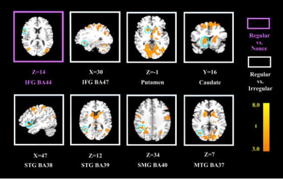 将规则动词过去式,不规则动词过去式,以及控制条件进行两两比较后,发现传统语言相关脑区有较大范围的激活(图2)。规则变化动词和作为基线的控制组比较结果显示,外侧裂周区和皮层下区域(the perisylvian and the subcotical areas)都有激活。显著激活的区域集中在双侧额下回的岛盖部分(the pars opercularis, Brodmann 44)以及左侧额下回的三角部(the left posterior triangularis, Brodmann 45)。不规则动词和基线条件的比较结果没有发现任何显著激活差异。