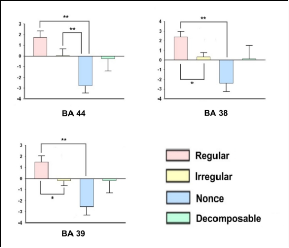 图4. 规则动词和可分解动词分别与不规则动词和基线条件比较结果