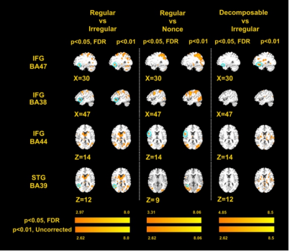 为确定产生抑制效应的神经通路,排除规则动词过去式和不规则动词过去式的差异仅仅依靠规则动词过去式和原形在字形方面简单重复的假设,我们将可分解单词与动词原形形式、规则屈折词、不规则曲折词进行了对比,如预测所示,可分解动词与控制组没有显著差异,可分解动词与不规则动词的加工过程对比结 果显示仅仅有少数几个区域显著激活,其中包括额下回眶部(Brodmann 47,p <.05 FDRcorrected)。