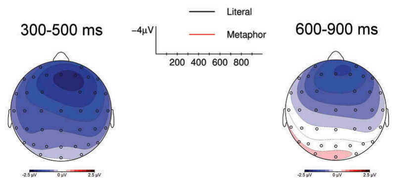 以上分析探讨了文学隐喻理解的神经机制问题,结果表明,与词语(literal expression)相比,文学隐喻在N400时窗激发了更多的负电位,伴随着一个额叶位置(frontal sites)的持续负效应(sustained negativity),这解释了为什么在理解文学文本中的修辞意义时需要花费更长时间的努力(long-standing effort)。此外,关于熟悉度的分析部分表明:越不熟悉的隐喻会激发更多的负反应(negative response)。