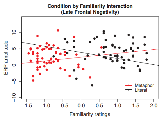 ERP(事件相关电位)是突触后电位的总和, 反映了与刺激呈现时间同步的大脑电反应的信号。本研究采用ERP实验对文学隐喻进行研究,首先,对N400时窗和600-900ms时窗的ERP数据进行方差分析;其次,为了弄清熟悉度(familiarity)在隐喻理解处理中的作用,作者对ERP实验采用了混合线性模型的框架。