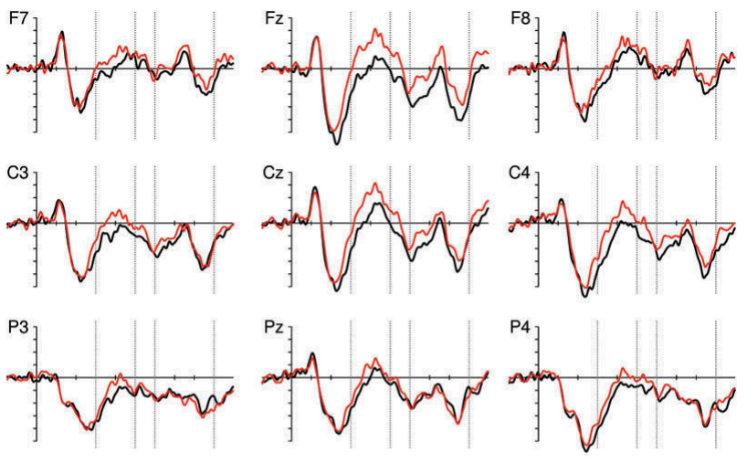 图1. 9个代表电极的ERPs结果(红线为隐喻,黑线为短语)