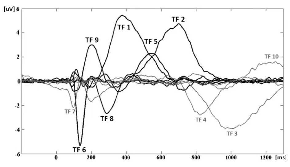 图5. 微伏标度下每个时间因素的因子负荷;简化解释最负峰值成分的负荷因子的极性;粗体线条代表统计分析所选的时间因素