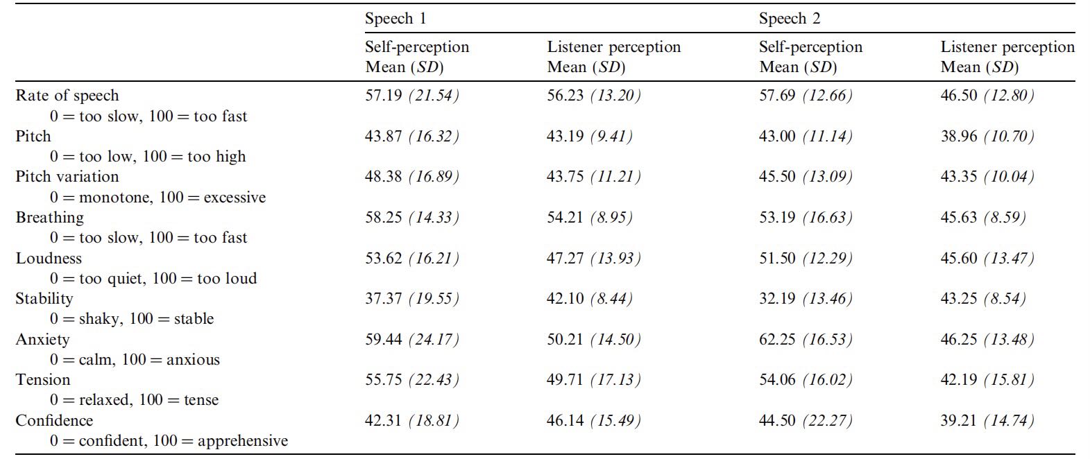 评分者有显著的多变量效应[F(13,18)=2.37;p<0.05;g2=0.631],这与单变量效应有关[F(1,30)=5.90;p<0.05;g2=0.164],响度[F(1,30)=5.48;p<0.05;g2=0.154]和声音颤抖[F(1,30)=7.54;p<0.01;g2=0.210]。除了这些声音知觉,也有显著的单变量冷静/焦虑评分的评分者差异[F(1,30)=11.24;p<0.01;g2=0.272]放松/紧张[F(1,30)=7.04;p=0.01;g2=0.190]。与听众的评价相比,演讲者认为自己说话更快,声音更大,声音更不稳定,认为自己更焦虑、更紧张、更不自信。