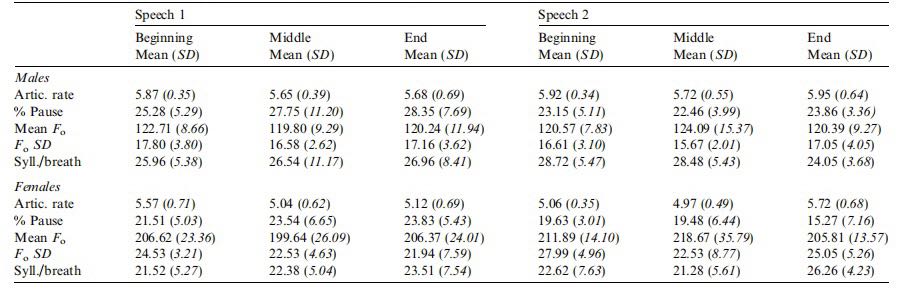 表1 两次演讲的声学平均数据(数据包括两个演讲发音速度的平均和标准偏,暂停百分比,Fo平均值,标准差以及每次呼吸音节数)