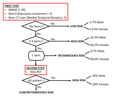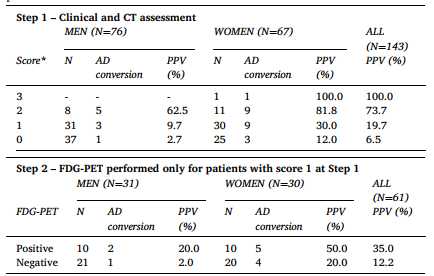 第一步是对满足MMSE<28,MoCA-executive<3,左MTA≥3的患者进行测试,凡是出现一种现象即增加1分,共0-3分。对于得分≥2的患者不需要FDG-PET评估,原因是他们的阳性预测值已经很高(平均75%)。得分=0的患者也不需要进行FDG-PET评估,因为其阳性预测值较低(6.5%)。得分=1的患者有中等风险(19.7%),对于这类患者有必要使用FDG-PET进一步评估。因此,在第一次临床和CT评估后,只有得分=1的患者需要进入第二步,接受FDG-PET检测。