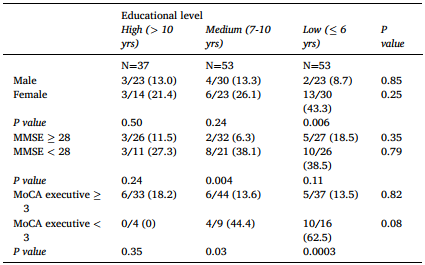 表2. 根据教育水平、性别和神经心理学测试得出的AD转化率