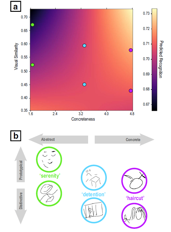 在对视觉相似性的探索性分析中,本研究通过VGG19 dCNN提取了不同意象的内容和特点,计算同一项目的不同意象之间的皮尔逊相关系数来获得这些意象的相似性分值,相似性分值越高代表该意象越接近概念原型。通过logistic回归分析来测量视觉相似性分值与单词的具体性对记忆效果的影响。结果显示,对于抽象的概念,独特的绘画内容更容易被记住,而对于具体的概念,接近原型的绘画内容给更容易被记住。(见图3)
