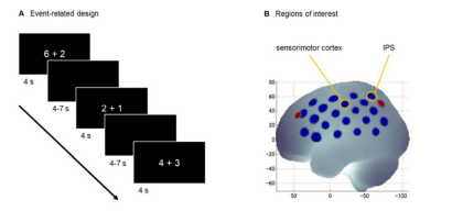 本研究设计了一个行为实验来考察被试在进行加法任务时的反应时和正确率。加法任务由40道个位数加法题组成,加法计算的结果在3到9之间的个位数。题目中一半题目不需要进行五进制操作(例如,3+1、6+2等),被试可用同一只手进行运算。另一半题目则需要进行五进制操作(例如,4+3、1+8等),被试在求解时需要从一只手交换到另一只手。在事件相关设计中,数字刺激以阿拉伯符号以随机顺序呈现,刺激持续时间为4秒,接着是4-7秒的休息时间。被试通过心算进行加法运算,并进行口头回答,见图1A。