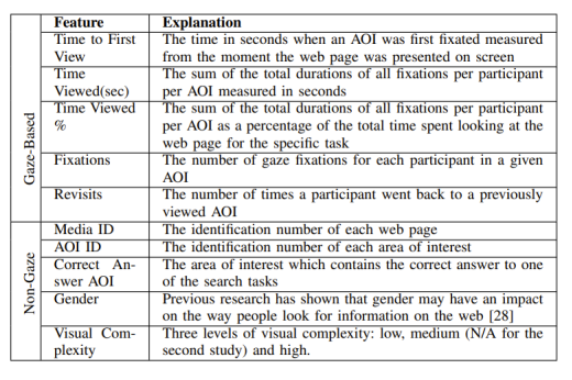首先对页面进行兴趣区域(AOI)划分,分为格状(2*2与4*4)和页面特定两种类型。其次进行特征划分,分为注视的和非注视特征。