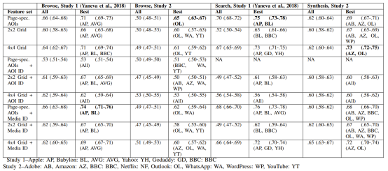 逻辑回归分析结果表明,与30s的浏览任务(0.65)相比,网页浏览时长为120s时模型的分类准确度更高(0.74);页面特定AOI比格状AOI(2*2,4*4)更能提高分类的准确性。