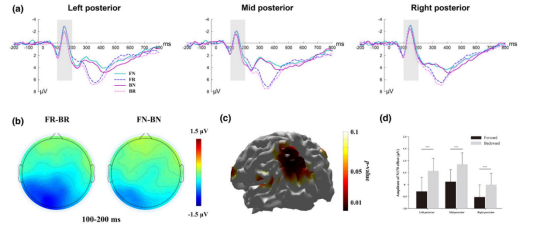 N170成分:在向前书写条件下,目标汉字诱发的负性N170成分比在向后书写条件下更偏向左侧,左侧顶上小叶可能是这一效应的来源。其次,书写方向对韩文阅读的N170成分没有影响。