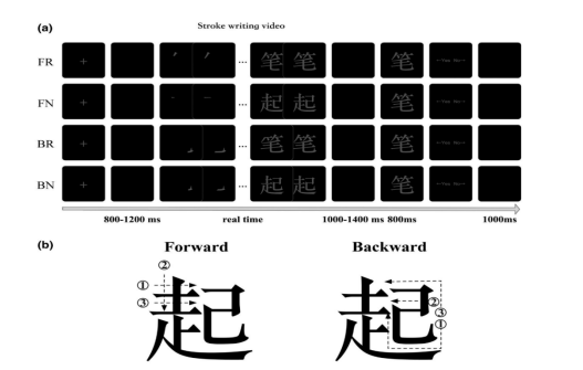 每组实验包括提示阶段和目标阶段。在提示阶段,参与者观看一段视频(见图1a),视频中汉字的书写方向为向前或向后,箭头表示笔画书写方向,数字表示笔画顺序(见图1b)。在目标阶段,参与者观看一个汉字的图片。最后,参与者需判断提示阶段与目标阶段的汉字是否相同。
