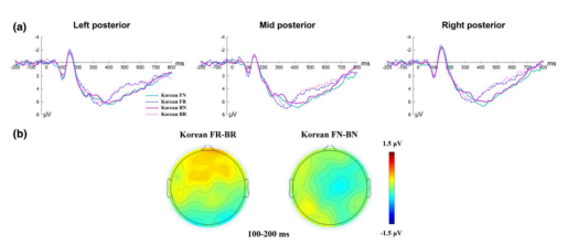 实验在以下时间窗口测量了每个成分的平均振幅:N170(中文、韩文)为100-200ms; N200(中文、韩文) 为200-230ms; N400(中文)为260-420ms; N400为260-360ms (韩文,基于ERP波形的目视检查)。然后,使用Greenhouse-Geisser方法对所得数据进行校正后,对每个脑电成分的平均振幅进行三因素重复测量方差分析,自变量为写作方向(2个水平:向前、向后),字符重复(2个水平:重复、不重复)和语言种类(2个水平:中文、韩文)。