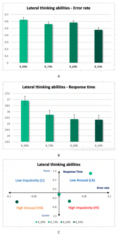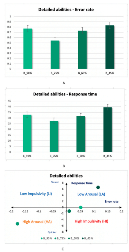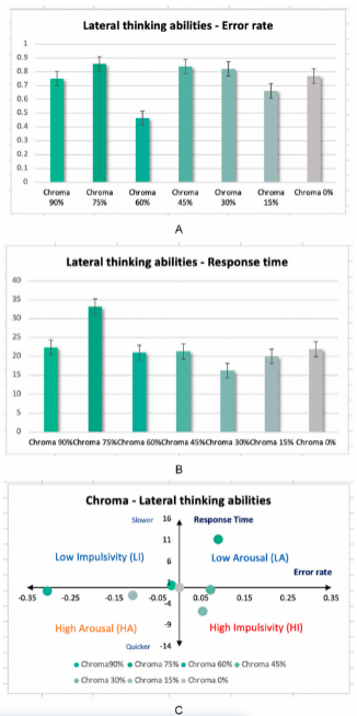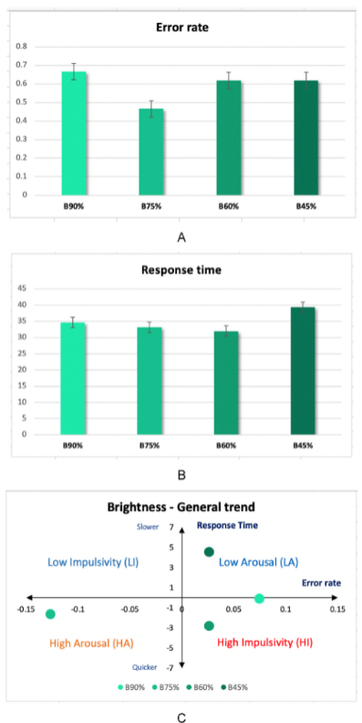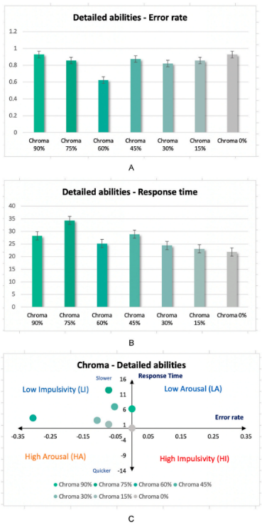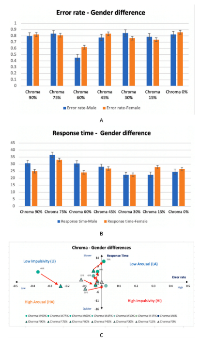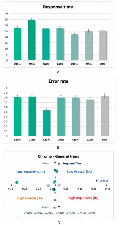 图1(A)和(B)显示了所有六种类型测试的响应时间和错误率的平均分数。图1(C)显示了VR背景色度对被试整体表现的影响。30%色度水平是被试表现最好(最兴奋)的地方,反应时间相对较短,错误率最低。针对反应时间(见图1A),被试在30%色度水平的背景下反应最快,而在75%色度水平的背景下反应最慢;即75%和60% [F (6,1169) = 4.5, (p = 0.050)]、30% (p = 0.01)、15% (p = 0.003)和0% (p = 0.005)色度背景之间存在显著差异。在错误率方面(见图1B),被试在60% [F(6,1169) = 10.9]色度水平背景比90%色度背景(p = 0.001)、75%色度背景(p = 0.001)、45%色度背景(p = 0.001)、30%色度背景(p = 0.001)、15%色度背景(p = 0.001)和0%色度背景(p = 0.001)的被试犯的错误率要低得多。