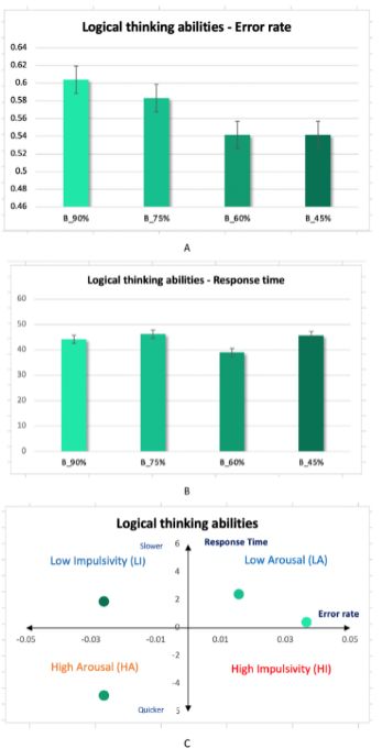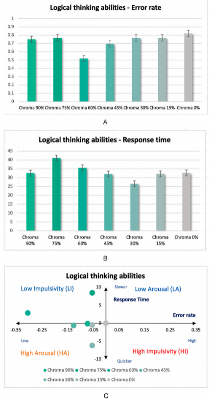 图3. (A)VR背景色度对被试逻辑能力测试的反应时间;(B)VR背景色度对被试逻辑能力测试的错误率;(C) VR背景色度对被试逻辑思考能力测试的整体影响。