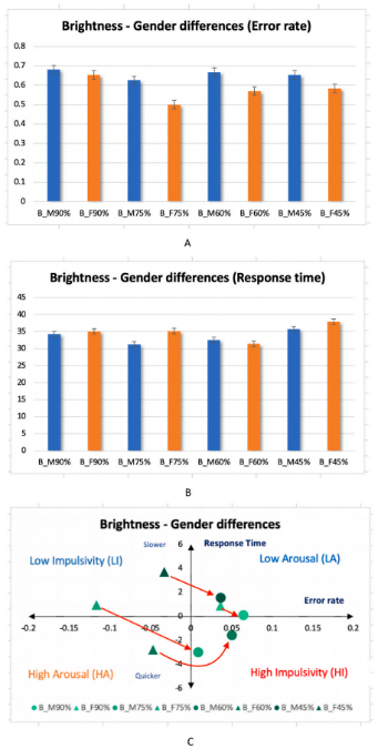 图2(A) - (C)显示VR背景色度对不同性别被试唤醒度和兴奋性的影响。在90%、75%、60%和45%色度时,男性被试比女性被试犯更多的错误,反应更慢。在色度为30%、15%和0%时,男性被试的错误较少,反应时间也相对较快。在60%色度背景下的错误率[F (1,166) = 4.8, (p = 0.030)],男性被试的错误率明显低于女性被试。因此,不同的色度背景对男性和女性被试有不同的影响。