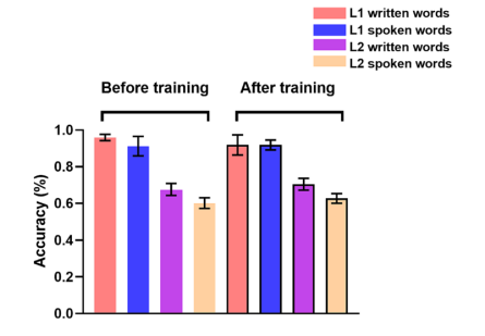 图1 训练前和训练后 L1和 L2语言命名的准确性。 L1 = 母语; L2 = 第二语言