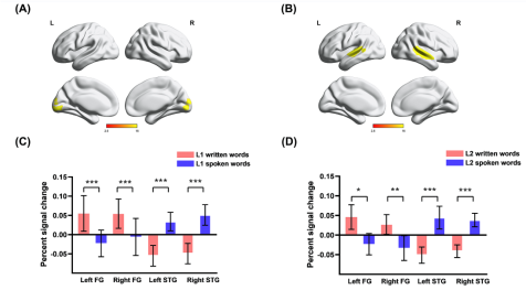 功能连接分析显示,书面和口头文字的加工与不同的神经网络有关。书面语比口语在双侧颞上回(延伸到枕极)激活更多,而口语比书面语在双侧颞上回(延伸到缘上回)激活更多(见图4A)。这些发现得到了我们的 ROI 分析的支持,这表明当处理书面语时,双侧梭状回更加活跃;当处理口语时,双侧颞上回更加活跃(见图4C及4D)。这些结果表明,书面语和口语的加工与不同的神经网络有关。
