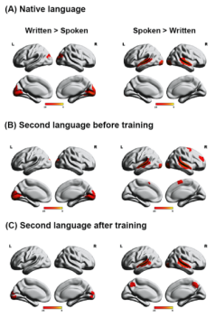 fMRI结果表明,训练后,在L2口语和书面语词汇加工过程中激活的大脑区域与在L1词汇加工过程中激活的大脑区域存在差异。在训练前后,L1和L2的书面和口语词汇之间的直接比较也证实了类似的结果(见图2图3)。具体来说,L1书面语引起双侧梭状回和右侧枕叶皮层的激活。在训练前,L2的书面语在双侧舌回梭状回和右侧枕叶皮层显著激活,而训练后,仅在双侧梭状回中观察到激活。